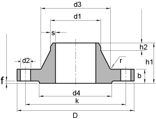 | DN | ISO | DIN | D | b | k | h1 | d3 | s | r | h2 | d4 | f | No. of Holes | d2 | KG/PCS |